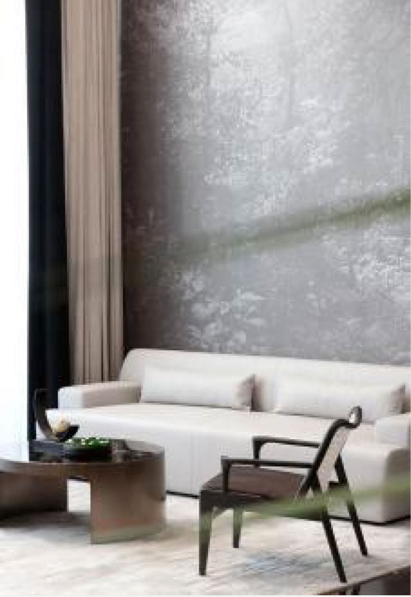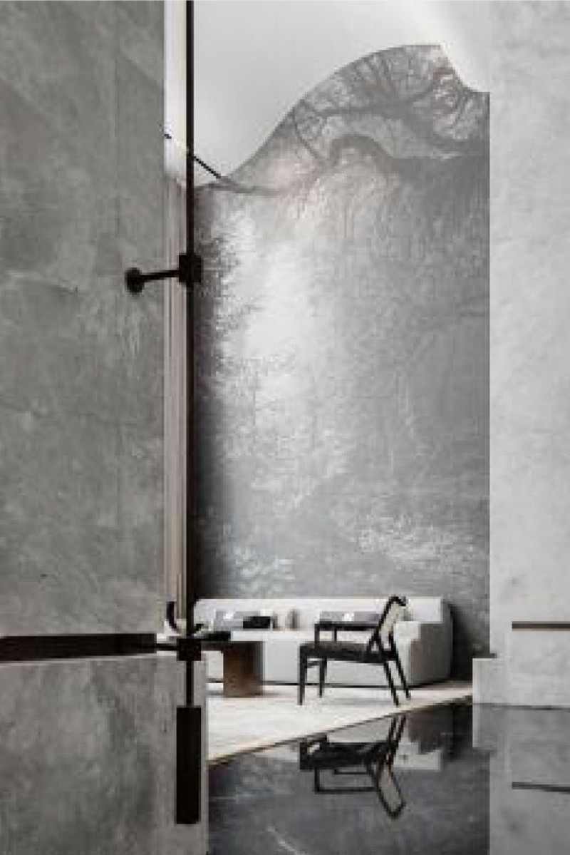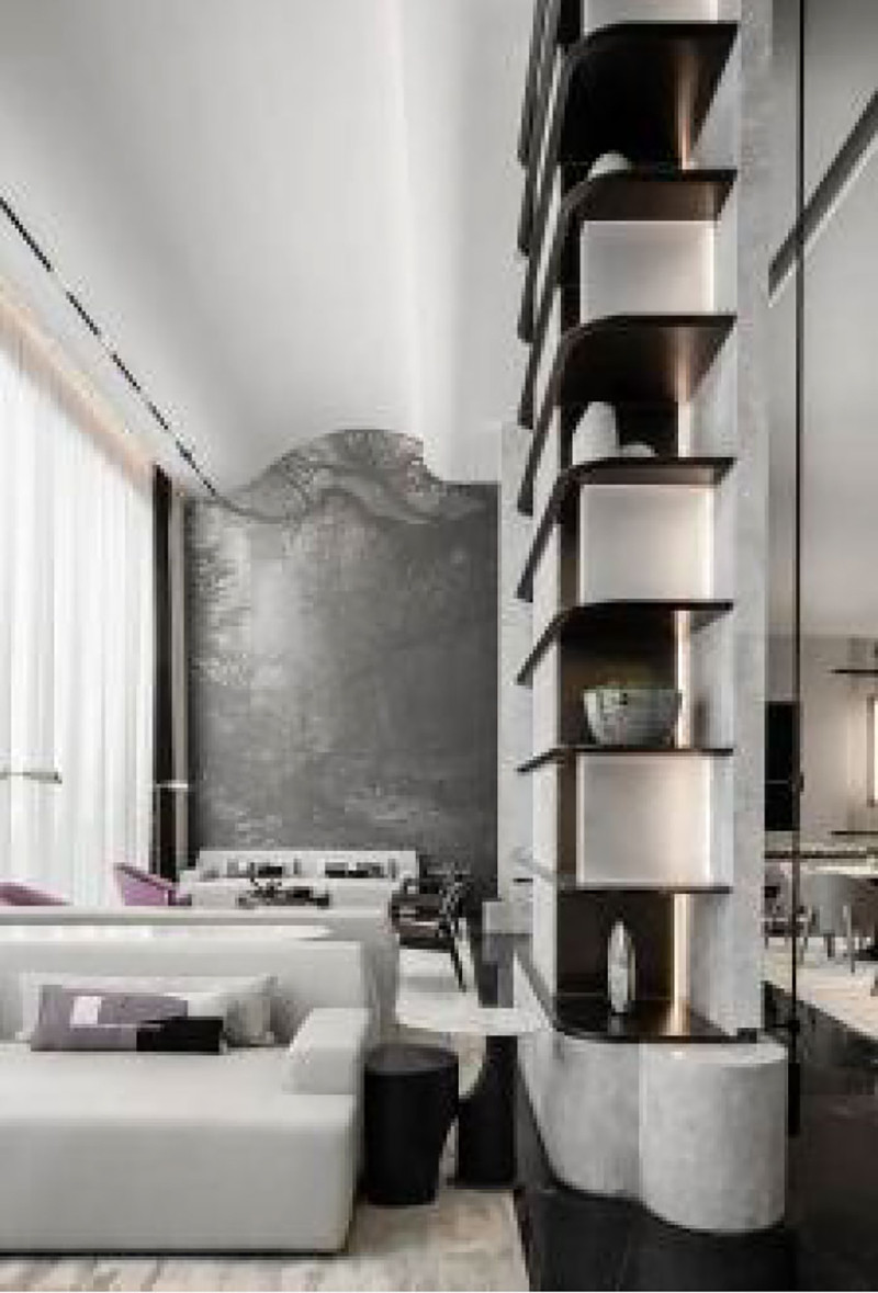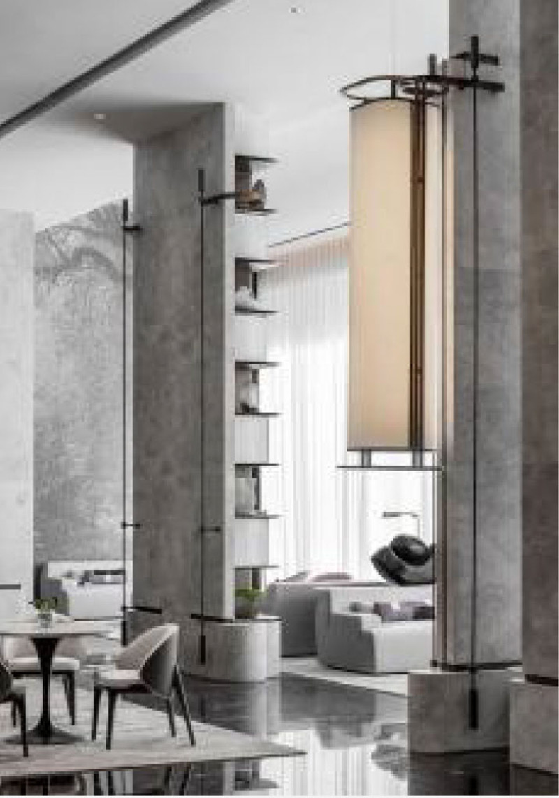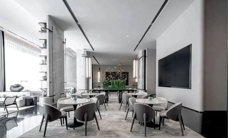 灰色是一种饶有趣味的颜色,朦胧又清透。墙面的艺术画卷选用灰色来表达,用一种“退”的姿态,去呈现风景之间远近、高低、明暗之间的对话。天花流动的曲线一气呵成,远观如同蜀地的雾霭。纯白的弧线将自然风光揽入,在挑高的空间中烟波流转。突破中式的繁琐,将自然景观演绎得灵活而具有意趣。